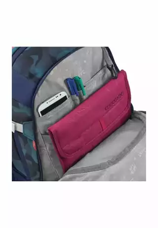 2 Hauptfächer, 1 Organizerfach, 1 Fronttasche und 2 dehnbare Netztaschen an den Seiten