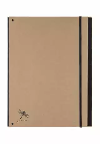 Pultordner für Dokumente im Format A4. Der Einband aus stabilem Graukarton ist mit recycelbarem Kraftpapier überzogen und hat einen dehnbaren Rücken. Die reißfesten Seiten aus schwarzem Karton sind mit schwarzen neutralen Taben aus langlebigem PP und drei Schaulöchern im Buchblock ausgestattet. Die Mappe zeigt eine dezente, schwarze Prägung einer Libelle und hat einen zusätzlichen Verschluss mit Gummizug.