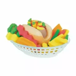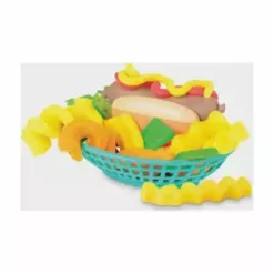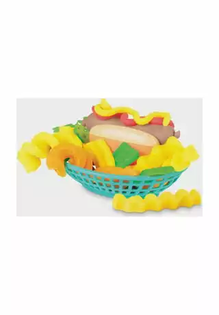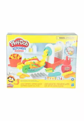 1 Spiralbratmaschine mit 2 Aufsätzen, 1 Pommestüte, 1 Kunststoff-Hotdog-Brötchen, 1 Korb, 1 Gewürzmühle, 1 Messer, 1 Walze, 1 Wellenschneidemesser, 1 Flasche Play-Doh Drizzle-Masse (59 ml), 5 Dosen Modelliermasse der Marke Play-Doh (3x 56g, 2x28g)