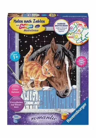 Dank der farbigen Motivlinien, können die Kinder das ganze Motiv Fohlen mit Kätzchen und die Farben schneller erkennen. Der Pinsel hat eine gute Führung und so entsteht nach und nach ein perfektes Bild. Die schönen Motive zum Ausmalen sind eine tolle Geschenkidee für Kinder ab 7 Jahren und eine schöne Dekoration für das Kinderzimmer. In diesem Malset sind bereits 15 fertig gemischte Acrylfarben enthalten. Mit Malen nach Zahlen von Ravensburger lernen die Kinder Flächen sorgfältig auszumalen, ihr Maltalent zu verbessern sowie feinmotorische Fähigkeiten zu entwickeln. Am Ende stehen Freude, Stolz und ein Erfolgserlebnis, das die Lust am Weitermalen weckt. Die Motive sind altersgerecht in drei Schwierigkeitsstufen umgesetzt: von einfachen Bildern mit wenigen, großen Malflächen bis hin zu Bildern mit vielen, kleinen Malflächen für Fortgeschrittene. Jedes Malset enthält alles, was Künstler zum Malen brauchen und es ist kein Mischen der Farben notwendig. Zusätzlich zur Maltafel, zu den Farben und zum Pinsel, ist in diesem Malset funkelnder Glitter enthalten. Sobald das Motiv fertig ausgemalt ist, wird der Glitter angemischt und aufgetragen. So entsteht wird das Motiv zum Glitzern gebracht. Das Ravensburger Malen nach Zahlen Programm bietet eine große Motivauswahl für Kinder und Erwachsene.