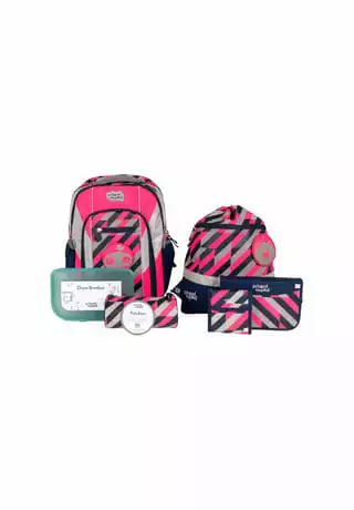 7-teiliges Schulranzen-Set von School-Mood, bestehend aus Schulranzen, Sportbeutel/Turnbeutel, Schüleretui (21-tlg.), Schlamperrolle, Brustbeutel, Brotdose und 3 Patchies. Klassischer Schulranzen der Loop Air+ Serie ist robust, wasserabwesend, leicht zu reinigen und lässt keine Wunsche offen. Selbstschließender Magnetverschluss ermöglicht ein kinderleichtes Öffnen und Schließen des Deckels. Das mitwachsende, ergonomisch geformte Tragesystem mit Brust- und Beckengurt bietet hervorragenden Tragekomfort und optimalen Sitz. Im Inneren ist der Schulranzen bestens ausgestattet und bietet Ordnung, Übersicht und viel Stauraum für Hefte, Bücher, Federmäppchen, Brotdose usw. Reflektierende Elemente sorgen für Sicherheit bei Dunkelheit. Mit wechselbaren Patchies für Motivaustausch lässt sich der Schulranzen immer neu und individuell gestalten. Dank integrierter Halterung kann der Sportbeutel am Schulranzen befestigt werden. Etui ist komplett bestückt (21tlg.) und verfügt über einen Stundenplan. Schulranzen Außenmaß: 28 cm x 22 cm x 36 cm / Gewicht: ca. 900 g / Volumen: ca. 20 l