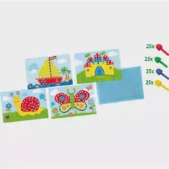 Von einer ritterlichen Burg über ein Boot auf See bis hin zu goldigen Tieren wie einer Schnecke oder einem Schmetterling – mit diesen lustigen Motiven ist Langeweile passé. Auch eigene Bilder und Ideen lassen sich ganz einfach auf das Mosaikbrett stecken. Abwechslung und kreativer Spielspaß sind vorprogrammiert! Das Set enthält 1 Steckplatte, 4 Vorlagen und Pins. Eine genaue Anleitung erklärt dir natürlich die einzelnen Schritte – so kann gar nichts mehr schiefgehen!